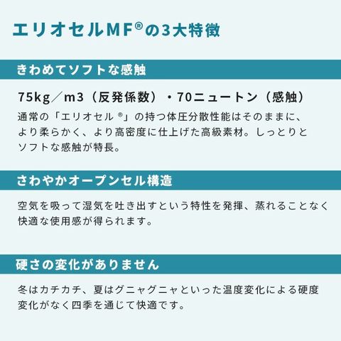 【きわめてソフトな感触】75kg/m3(反発係数)・70ニュートン(感触)通常の「エリオセル ?」の持つ体圧分散性能はそのままに、より柔らかく、より高密度に仕上げた高級素材。しっとりとソフトな感触が特長。