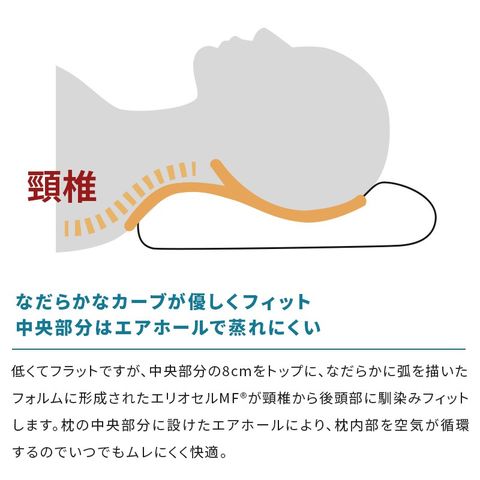 低くてフラットですが、中央部分の8cmをトップに、なだらかに弧を描いたフォルムに形成されたエリオセルMF?が頸椎から後頭部に馴染みフィットします。枕の中央部分に設けたエアホールにより、枕内部を空気が循環するのでいつでもムレにくく快適。