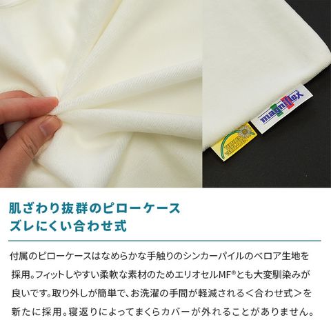 付属のピローケースはなめらかな手触りのシンカーパイルのベロア生地を採用。フィットしやすい柔軟な素材のためエリオセルMF?とも大変馴染みが良いです。取り外しが簡単で、お洗濯の手間が軽減される<合わせ式>を新たに採用。寝返りによってまくらカバーが外れることがありません。