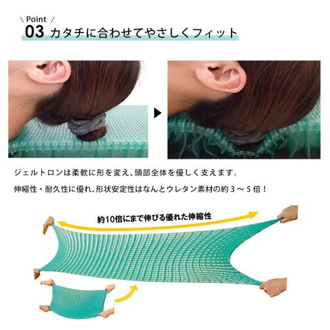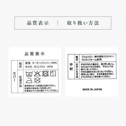 | 組成 | [まくら] ジェルトロン(熱可塑性エストラマー)、ウレタンフォーム併用 [カバー] 表面:オーガニックコットン100% 中わた:ポリエステル100% |