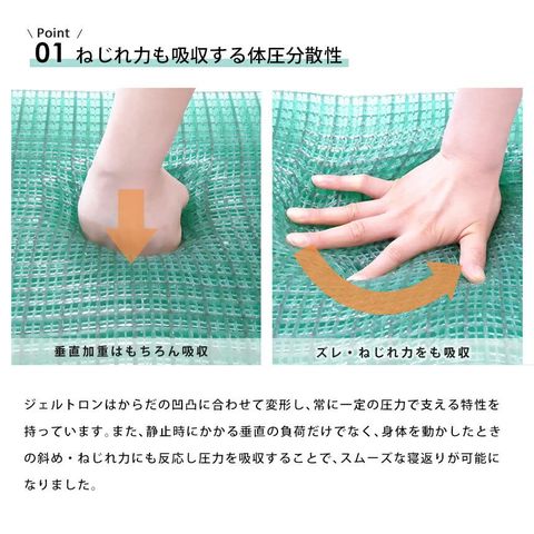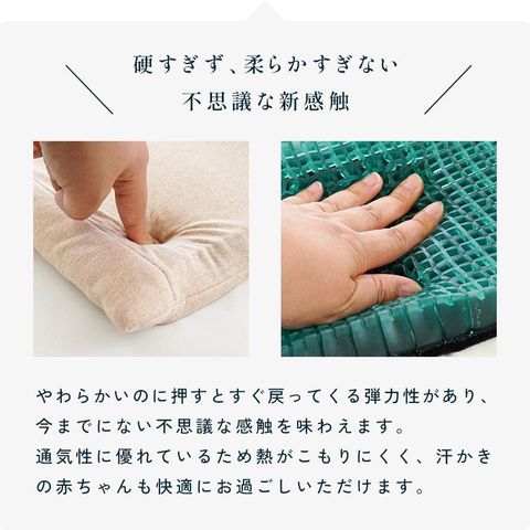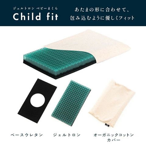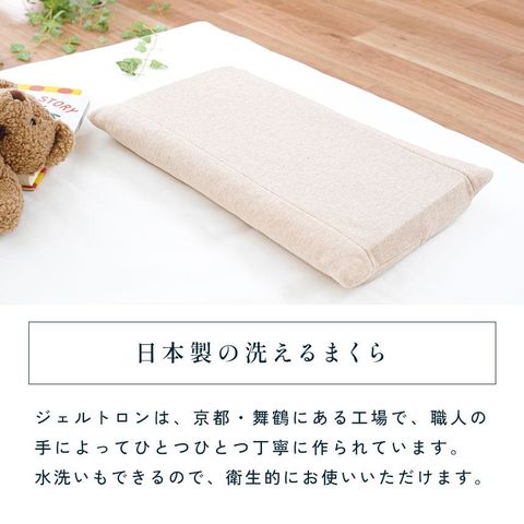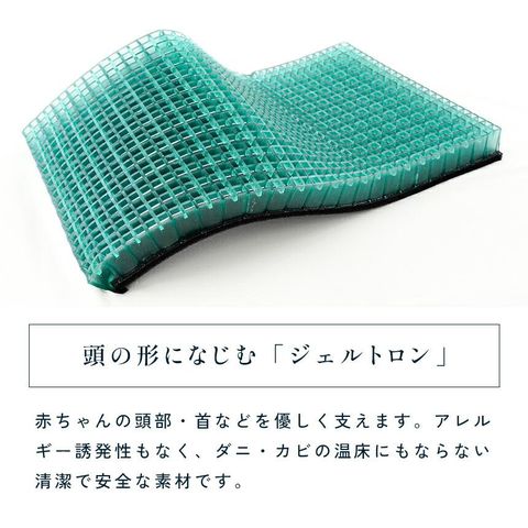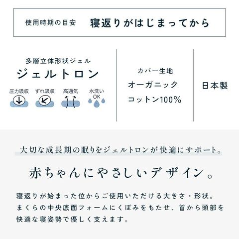 大切な成長期の眠りをジェルトロンが快適にサポート。寝返りが始まったくらいからご使用いただける大きさ・形状・まくらの中央底面フォームにくぼみをもたせ、首から頭部を快適な寝姿勢で優しく支えます。 ・頭の形になじむ「ジェルトロン」 赤ちゃんの頭部・首などを優しく支えます。アレルギー誘発性もなく、ダニ・カビの温床にもならない清潔で安全な素材です。硬すぎず、柔らかすぎない不思議な新感触。やわらかいのに押すとすぐ戻ってくる弾力性があり、今までにない不思議な感触を味わえます。通気性に優れているため熱がこもりにくく、汗かきの赤ちゃんも快適にお過ごしいただけます。 ・「ベースウレタン」でフィット性UP 中央部を円形状にカットしたベースウレタンが後頭部にフィットするように優しく支えます。 ・「オーガニックコットン100%」生地カバー 人にも自然にも優しいオーガニックコットンを使用しました。刺激が少なく吸水性に優れるため、汗をかきやすい赤ちゃんにピッタリの素材です。首元に当たるカバー部分に中わた(ポリエステルわた)を詰め、ソフトな感触に。頭部から首にかけてやさしくフィットします。伸縮性のあるカバーで枕の形にカバーがしっかり沿います。 ・日本製の洗える枕 ジェルトロンは、京都・舞鶴にある工場で、職人の手によってひとつひとつ丁寧に作られています。水洗いもできるので、衛生的にお使いいただけます。 ・ジェルトロン(GELTRON)とは 多層一体成型で作られた立体形状ジェル。グミキャンディのような感触で、体圧分散性・ずれの吸収性・通気性・衛生性に優れています。素材の特性から医療の現場でも使用されるなど、様々な用途に活用されています。 | |