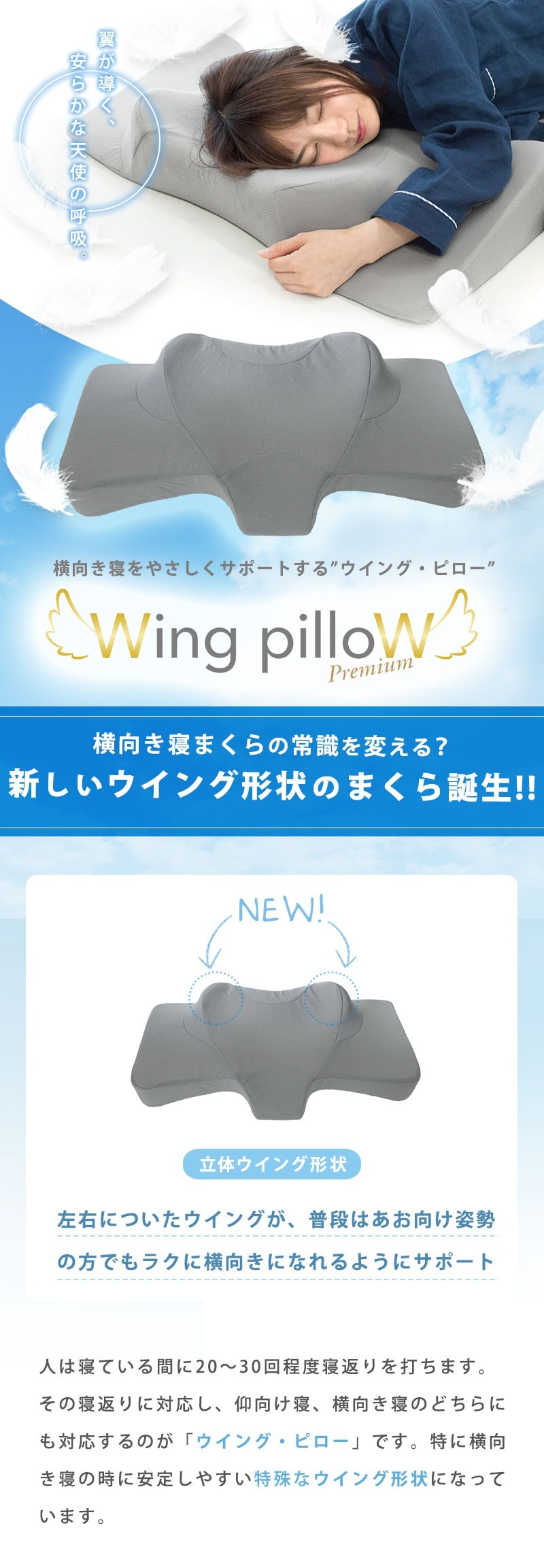 人間工学に基づいた独特のカタチの立体ウィング形状で、横向き寝の首・肩をサポート。気道を塞がず自然な寝返りへと導きます。