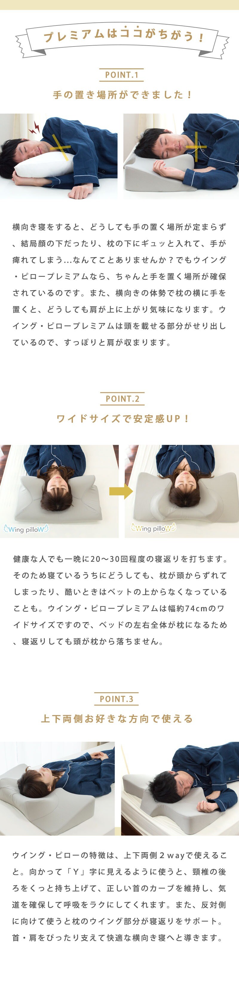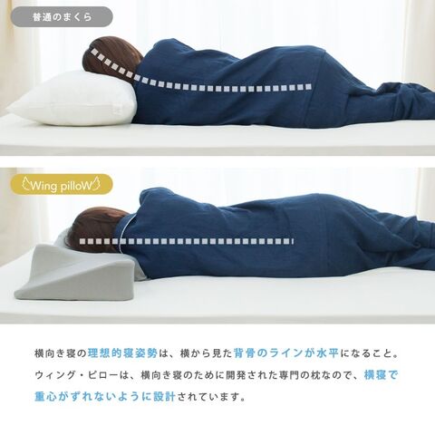 まくらの使い方について 食べ物の好き嫌いがひとりひとり違うように、寝姿勢にも人によって合う、合わないがあります。そのため横向きに寝る姿勢がどうしても苦しい場合、無理して横向き寝を続けることはおすすめしません。「ウイング・ピロー」は仰向け寝やうつぶせ寝にも対応するので、どうぞご自身が一番しっくりきた寝方でおやすみください。 |