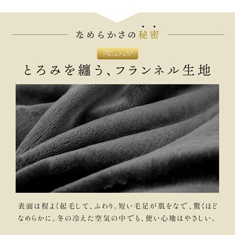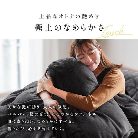 | 上品なオトナの艶めき、極上のなめらかさ 仄かな艶が誘う、大人の気配。ベルベット級の光沢、しなやかなフランネル。肌に寄り添い、なめらかにすべる。纏うたび、心まで解けていく。 とろみを纏う、フランネル生地表面は程よく起毛して、ふわり。短い毛足が肌をなでて、驚くほどなめらかに。冬の冷えた空気の中でも、使い心地はやさしい。 静かに温める、確かなぬくもり。しっかりと目の詰んだ生地が空気層をつくり、夜通しあたたかく、体温を上品に保つ。すっぽりと身を委ねれば、心まで温もる。 一枚、二役。冬は掛け布団カバーとして上質に保温。春秋は毛布としてしっとり軽やかに。一枚使いでも毛布として頼れるから、ワンルームでも上品にミニマル。 季節をまとう2Way。端まで大きく開くファスナーを左右に。布団の角まで手が届き、ひも留めはラクに、仕上がりは上品に。暮らしに、余裕という心地よさを。 両サイドファスナーで、フルオープン。均一に施したキルトが中わたの偏りを抑え、寝返りや洗濯後もふっくらとした厚みをキープ。生地に繊細な陰影が生まれ、機能も佇まいも、上質に整います。 着脱は、優雅に簡単。四隅のゴムがマットレスにしっかり固定。寝返りでもズレにくく、装着・取り外しはワンアクション。気になった時にさっと外して洗え、清潔もスマートに。 端正に、美しく。しっとりキルト縫製しなやかな2本ゴムが面全体を均一に押さえ、フィットは朝まで凛として。洗いたい時はさっと外して、また端正に整います。 四隅で留める、上質な安定。四隅ゴムバンド付きおうちの洗濯機で気軽にケア。しっとりしたとろみ感はそのままに、心地よさを清潔に保ちます。 静かに支える、二本の品格 ゴムバンド付き受け継がれてきた伝統と、現代の睡眠研究。素材選定から縫製・検査まで、上質のための基準を一枚に。毎晩つかうものだからこそ、迷わず“西川製”。 気が向いたら、洗うだけ。清潔が暮らしの標準に。「纏生(まとい)」は、冬の空気をやわらげるために生まれた、なめらかフランネルのシリーズ。寒い夜もふわりと空気を含み、ため息がひとつ。至福は、そっと日常に。 | |