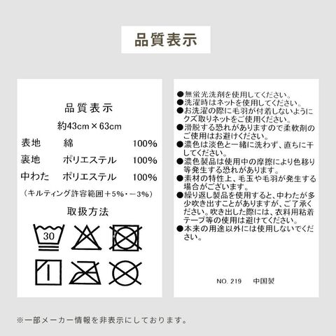 | サイズ | 約 43 × 63 cmキルティング加工製品 許容範囲+5%-3% |