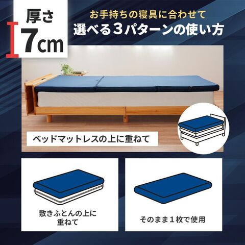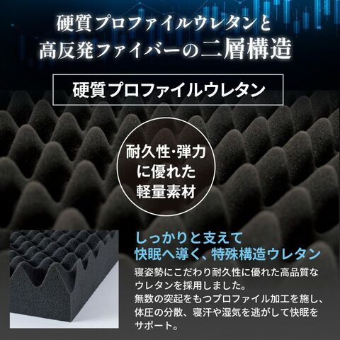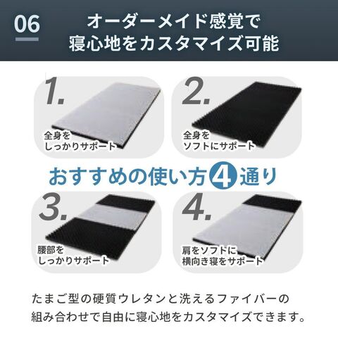 | ・高い反発性と弾力性で寝返り促進 “寝返り”には、血流促進や体温調節、日中の活動で歪んだ背骨を調整する働きがあります。 寝返りするときは覚醒しやすいため、一晩に30回ほど打つ寝返りを高反発の力でスムーズにすることで、熟睡を保ち睡眠の質を高めます。 ・しっかり支えて、ムレずに快適。二層構造で理想の寝心地へ耐久性・弾力に優れたプロファイルウレタンと、通気性抜群の高反発ポリエチレンファイバーの二層構造。 ウレタンの無数の突起が体圧を分散し、寝汗や湿気を逃して快適さをキープ。 さらに、丸洗いも可能で清潔な3次元構造ファイバーが寝返りなどの動きをサポート。質の高い「動的睡眠」を実現します。 ・高弾性と体圧分散で腰の負担を軽減高い弾力性と押し上げる力により全身の体圧が分散されるため、身体の1か所への負担集中を軽減。 腰が「くの字」に沈みこまず、理想の寝姿勢をサポートします。 ・丸洗いできる、吸水速乾ニットカバー採用カバーはご家庭の洗濯機で丸洗いOK! 取り外しがしやすいL字ファスナー仕様。通気性に優れた、吸水速乾性ニットを使用しています。さらに抗菌・防臭加工でいつでも清潔。 ・中身はローテーションできて長く使える側生地ファスナーの開け締めでウレタンの取り出しが可能。 へたりやすい中央腰部分の中材を頭部や足元とローテーションして使用することにより、より長くお使いいただけます。 ・オーダーメイド感覚で寝心地をカスタマイズ可能硬質ウレタンと洗えるファイバーを自由に組み合わせ、自分好みの寝心地に調整できます。 ・三つ折りで取り扱い楽々使わないときは、押入れやクローゼットなどの収納やお部屋のデッドスペースに片付けられます。 | |