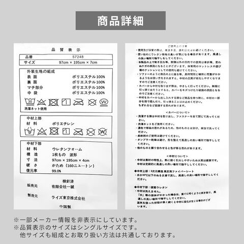 | 仕様 | 【側地カバー】 L字ファスナー YKKファスナー使用 吸水速乾 抗菌・防臭 【中材】 ・高反発ポリエチレンファイバー 手洗い可能 ・ウレタンフォーム 構造:1枚もの 波形 硬さ:かため(160ニュートン) 復元率:99.0% |