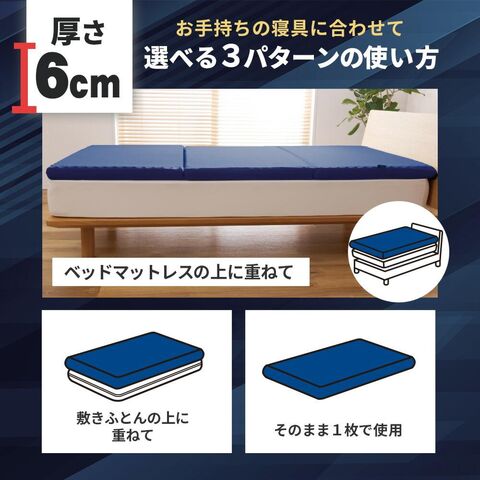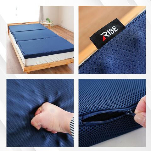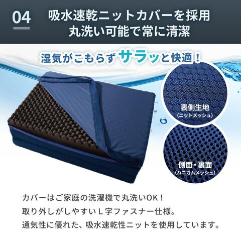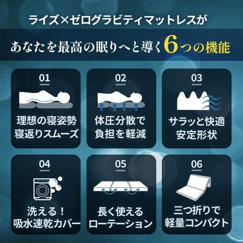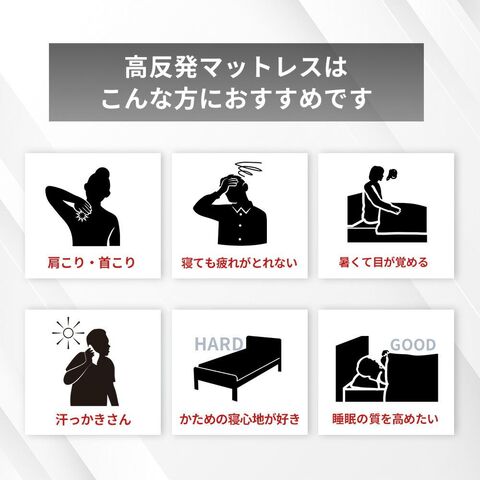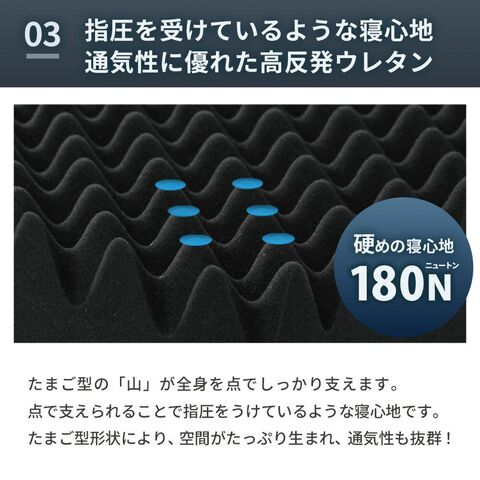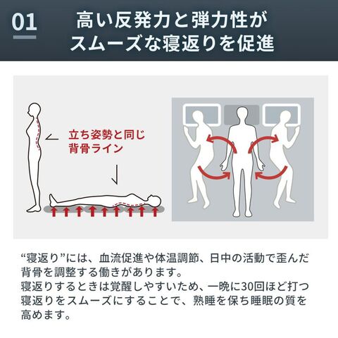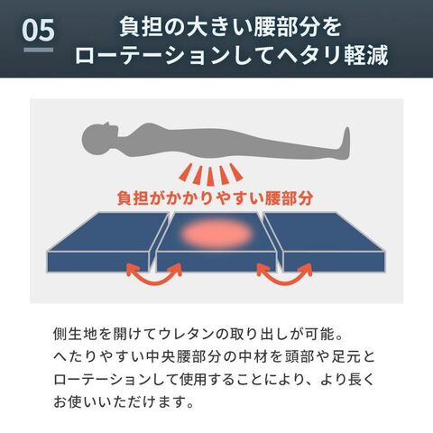 | ・高い反発性と弾力性で寝返り促進 “寝返り”には、血流促進や体温調節、日中の活動で歪んだ背骨を調整する働きがあります。 寝返りするときは覚醒しやすいため、一晩に30回ほど打つ寝返りを高反発の力でスムーズにすることで、熟睡を保ち睡眠の質を高めます。 ・高弾性と体圧分散で腰の負担を軽減高い弾力性と押し上げる力により全身の体圧が分散されるため、身体の1か所への負担集中を軽減。 腰が「くの字」に沈みこまず、理想の寝姿勢をサポートします。 ・丸洗いできる、吸水速乾ニットカバー採用カバーはご家庭の洗濯機で丸洗いOK! 取り外しがしやすいL字ファスナー仕様。通気性に優れた、吸水速乾性ニットを仕様しています。 ・中身はローテーションできて長く使える側生地ファスナーの開け締めでウレタンの取り出しが可能。 へたりやすい中央腰部分の中材を頭部や足元とローテーションして使用することにより、より長くお使いいただけます。 ・三つ折りで取り扱い楽々使わないときは、押入れやクローゼットなどの収納やお部屋のデッドスペーズに片付けられます。 | |