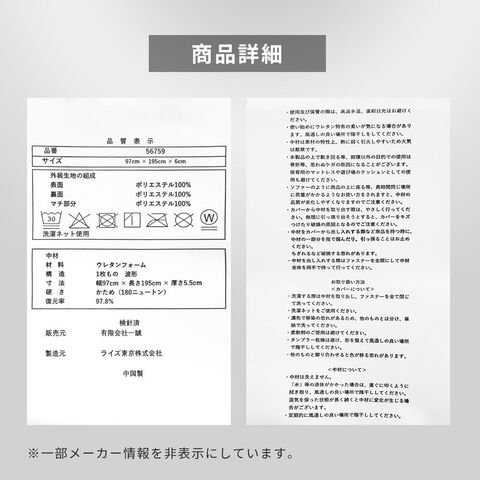 | 仕様 | 【側地カバー】 L字ファスナー YKKファスナー使用 【中材】 構造:1枚もの 波形 硬さ:かため(180ニュートン) 復元率:97.8% |