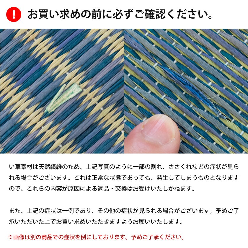 ※い草は天然繊維のため、正常な商品であっても、一部の割れ・ささくれなどが発生している場合がございます。これらが原因による返品・交換はお受けできませんので、予め了承下さいませ。