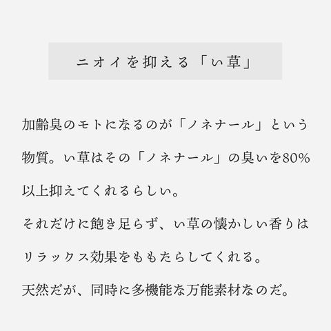 | ニオイを抑える「い草」 加齢臭のモトになるのが 「ノネナール」という 物質。 い草はその「ノネナール」の臭いを 80% 以上抑えてくれるらしい。 それだけに飽き足らず、い草の香りは リラックス効果をももたらしてくれる。 天然だが、同時に多機能でもある万能素材なのだ。 |