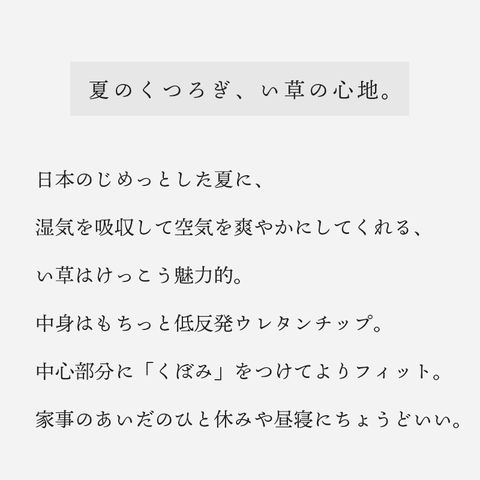 | 夏のくつろぎ、い草の心地 日本のじめっとした夏に、 湿気を吸収して空気を爽やかにしてくれる、 い草はけっこう魅力的。 中身はもちっと低反発ウレタンチップ。 中心部分に「くぼみ」をつけて頭によりフィット。 家事のあいだのひと休みや昼寝にちょうどいい。 |