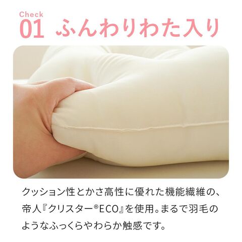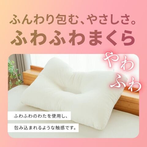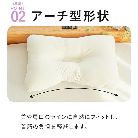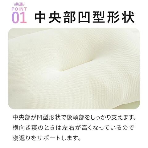| ・共通POINT 01 中央部凹型形状 中央部が凹型形状で後頭部をしっかり支えます。横向き寝のときは左右が高くなっているので寝返りをサポートします。 ・共通POINT 02 アーチ型形状首や肩口のラインに自然にフィットし、首筋の負担を軽減します。 ・ふんわり包む、やさしさ。ふわふわまくらふわふわのわたを使用し、包み込まれるような触感です。 ・Check 01 ふんわりわた入りクッション性とかさ高性に優れた機能繊維の、帝人『クリスター(R)ECO』を使用。まるで羽毛のようなふっくらやわらか触感です。 ・Check 02 ピーチスキン生地肌触りの良いやわらかなピーチスキン生地を使用。なめらかでやさしいタッチが、快適な寝心地をサポートします。 ・Check 03 洗濯機で洗える洗濯ネット使用で、ご家庭で洗えるのでいつでも清潔にお使いいただけます。※もちもち枕はお洗濯できません。 | |
