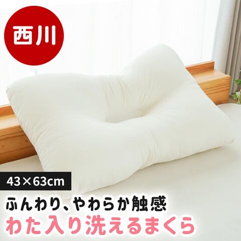 西川 枕 わた入り枕 中央凹型 くぼみ枕 アーチ形状 ふんわり わた枕 ピーチスキン生地 洗濯機で 洗える (ふわふわわたまくら)【MSP-EH94009337IV】
