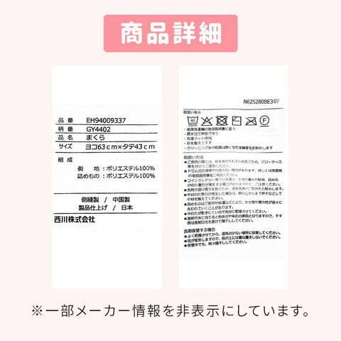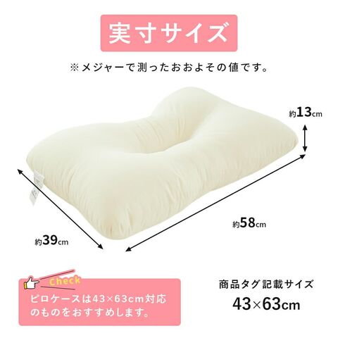 | サイズ | 約43×63cm 商品タグ記載サイズ ピロケースは43×63cm対応のものをおすすめします。 |