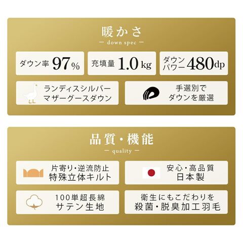 | 仕様 | プレミアムハンドセレクト ランディスシルバーマザーグースダウン使用 国内パワーアップ加工 グッドふとんマーク ダウンパワー480dp ループ8ヶ所 ノンスライド(特殊立体キルト) ファイン・プロテクト加工 ピュアオゾン加工 |