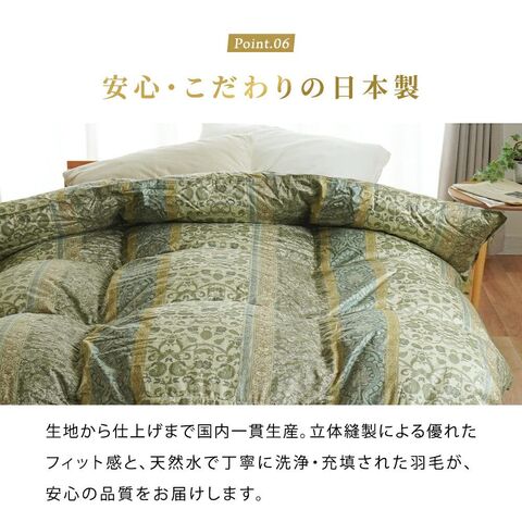 | ・希少・最上質の素材を熟練の職人が極上のダウンへ 経験豊かなバイヤーが産地に足を運び、選び抜くのは熟成された上質な羽毛だけ。機械での洗浄・選別を経た原毛は、さらに熟練の職人が手作業で吟味し、真に優れたダウンボールだけを取り出します。一日にわずか約300gしか仕上げられない、その希少性こそが、格別の品質を生み出しています。 ・ランディスマザーグースダウンを贅沢に約4年かけて大切に育てられたランディスマザーグースは、世界的に名高い中国・安徽省六安市産のプレミアムダウン。濃密で力強いダウンと、上品なグレー羽毛が魅力です。 ・マザーグースとは繁殖用に長期飼育されたものが「マザーグース」。体の大きなマザーグースは、空気を多く含む大粒ダウンで優れた保温力を発揮します。 ・片寄り・逆流を防ぐ、特殊立体キルト新開発「ノンスライドキルト」は、羽毛の片寄りや逆流を防ぐ特別構造。体に沿う部分は密に、広い部分はゆったりと設計され、保温性とフィット感を両立します。羽毛本来のふくらみを活かし、快適なボリューム感が長く続きます。 ・ファイン・プロテクト加工輸入時に圧縮された羽毛を、本来のふっくらとした品質へと復元。混ざったファイバーやゴミを取り除き、高温・高圧で殺菌・抗菌・防臭加工を施します。清潔で快適な羽毛に仕上げます。 ・ピュアオゾン加工羽毛にはオゾン(O3)による「ピュアオゾン加工」を施しています。 臭いの原因となる分子を分解し、優れた脱臭・殺菌効果で、より清潔で衛生的な仕上がりを実現しています。 ・100単サテン超長綿生地繊維が長く、しなやかでソフトな超長綿を使用。優れた吸湿性と通気性を持ち、100番手の糸が生み出すとてもやわらかな肌触りが特長です。 ・安心・こだわりの日本製生地から仕上げまで国内一貫生産。立体縫製による優れたフィット感と、天然水で丁寧に洗浄・充填された羽毛が、安心の品質をお届けします。 | |