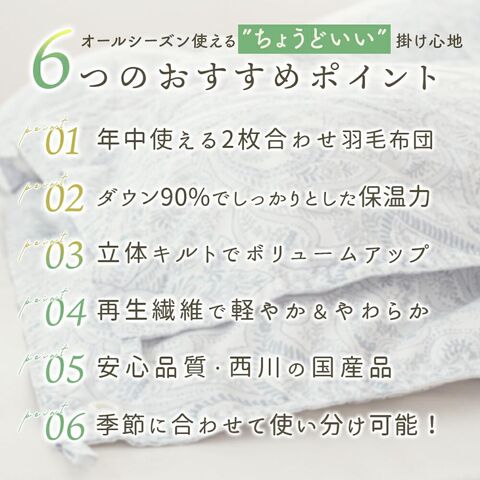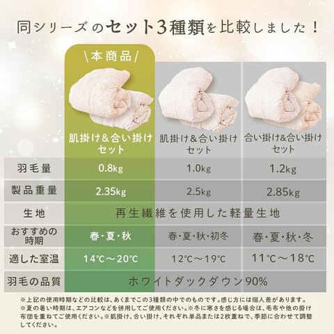 | セット内容 | 羽毛肌掛け布団(0.3kg入り)1枚 合い掛け布団(0.5kg入り)1枚 |