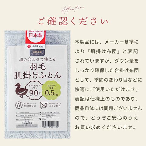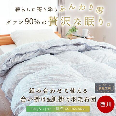 【12/21~12/31迄10%OFFクーポンあり】西川 2枚合わせ羽毛布団 シングル 国産 オールシーズン ホワイトダウン90% 0.8kg 合掛け 肌掛け デュエット 羽毛布団 当社限定 (グレー)【SET-KE051517-GY】