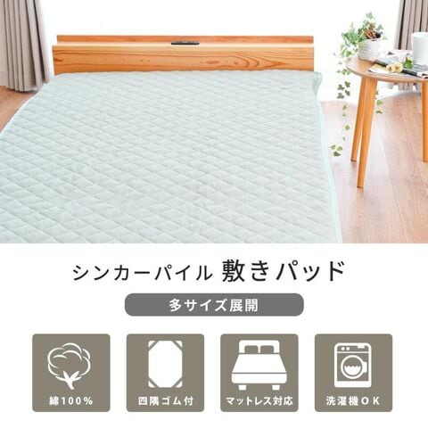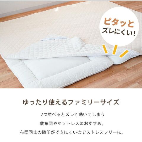 | ・汗をかいてもサラサラ快適 きめ細やかでふんわりと長めのループが特徴的なシンカーパイル織りを採用。寝汗や湿気をしっかり吸収し、ベタつきにくくさらっと清潔。汗かきな方に特にオススメです。 ・お肌にやさしい綿100%お肌に直接触れるパイル部分に、天然素材の綿を使用。敏感肌の方やお子さまでも安心してお使いいただけます。しっかり汗を吸収・発散し、快適な寝心地に。 ・オールシーズン使える夏は汗を吸い取ってさらっとさわやかに、冬はヒヤッとしないタッチでやわらかな寝心地。汗や湿気を吸収・発散することでムレ感を軽減。季節問わず快適にお使いいただけます。 ・洗濯機で気軽に洗えるご家庭でお洗濯OKだから毎日清潔にお使いいただけます。※お洗濯の際は必ず洗濯ネットを使用してください。※洗濯前にお使いの洗濯機の取扱説明書をご確認ください。 ・四隅ゴム付きで着脱カンタンベッドマットレスにも、敷き布団にも使えます。四隅ゴム付きで着脱がとっても便利。寝返りが多い方でもズレにくく、快適に使用できます。 ・選べるサイズ展開ちょっとしたリラックスタイムにも快適なごろ寝マットサイズから、家族みんなで広々寝られるファミリーサイズまで幅広くご用意! 2つ並べるとズレて動いてしまう敷布団やマットレスにおすすめ。 布団同士の隙間がでにくいのでストレスフリーに。 | |
