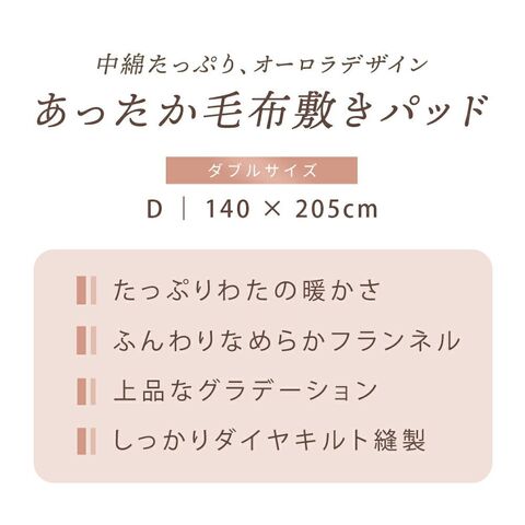 | ・ほっこり、たっぷりわたの暖かさ。 中綿をたっぷりと増量し、ふっくらと仕上げました。寒い夜も背中からやさしく包み込み、心まであたためてくれる頼もしい冬の相棒です。 ・ふんわりあったかフランネル生地とろけるようななめらかさのフランネル生地。やわらかな手ざわりとほどよい光沢が、毎日のくつろぎ時間をより心地よくしてくれます。 ・まるでオーロラのようなグラデーション淡く溶け合うトーンが織りなす上品なグラデーション。穏やかな温もりを感じさせるデザインで、落ち着いたトーンが寝室にやすらぎを添えます。 ・しっかりダイヤキルトたっぷり詰めた中わたが偏らないよう、丁寧にキルト加工を施しました。キルトはわたズレを防ぐだけでなく、表面にほどよい表情を添えてくれます。 ・ズレを防止する四隅ゴム付き敷きパッドの四隅には、お布団と敷きパッドを固定するゴムバンド付き。敷き布団にもマットレスにもお使いいただけるようになっています。 ・ご家庭で洗えていつでも清潔汚れてもご家庭で手軽にお洗濯できるから、いつでも清潔で気持ちよくお使いいただけます。 | |