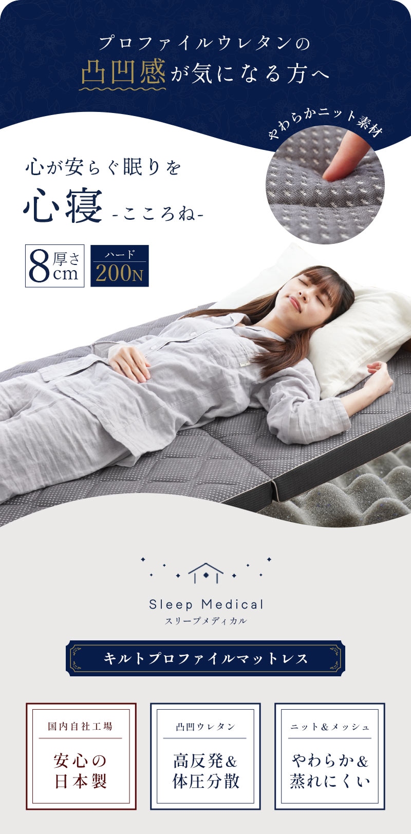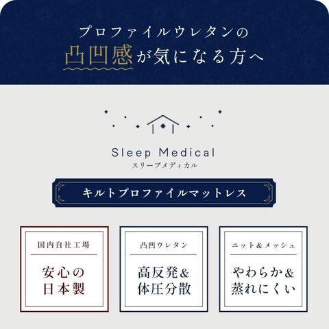 ・健康は、眠りから。 当社のオリジナルブランド Sleep Medicalは、健康で素敵な毎日を眠りで サポートすることを目指します。 あなたの明日が、元気で、健やかで ありますように。 ・国内自社工場で製造ウレタンカットから商品化まで全て自社工場で行っています。国内有数メーカーのマットレスにも使用されているアキレス社のウレタンを使用しています。 ・硬めの高反発ウレタンが寝返りをサポート高い反発力・程よいクッション性で寝返りをサポート。寝返りをすることで血行を促し、身体の負担を軽減するとともに、身体と敷き布団の間にある湿気を発散してくれます。 ・理想的な寝姿勢をキープする形状一つ一つの「点」が優しく全身を支えてくれます。この形状で身体に合わせて体圧分散し、立ち姿に近い理想の寝姿勢をキープします。 ・底付き感のないしっかりとした寝心地床に直接敷いても底付き感がなく、しっかりとしたクッション性のある寝心地です。 表面は中綿入りニット生地のため、柔らかな触り心地でプロファイルウレタンの凸凹感を軽減します。裏面、側面には通気性の良いメッシュ生地を使用しています。 折りたたみ簡単な三つ折りタイプ。使わないときは立てかけて湿気対策ができます。コンパクトに収納できるので来客用にもおすすめです。 |