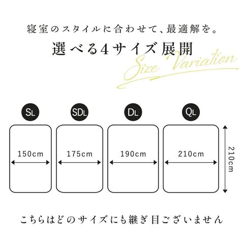 | その他注意 | ■2025年9月より新色を追加して販売しております。 ■写真はシングルサイズを使用しています。 ■洗濯の際は、タグなどに表記されている内容を必ず確認してから行ってください。 ■洗濯機をご使用される場合は、必ず洗濯機の取扱説明書に従ってください。 ■できるだけ実物と同じ色合いになるよう徹底していますが、ご使用の端末やブラウザなどにより実物と色合いが異なって見える場合がございます。 ■重さの表記をしておりますが、およその値です。わずかですが個体差があることをご考慮下さいませ。 ■商品のサイズ・重量は約表記です。サイズ・重量を保証するものではございませんのでご了承ください。 |