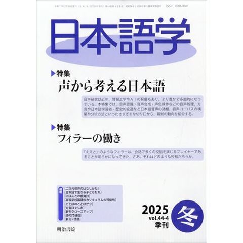近年、日本語の音声研究はますます多様化しているが、なんと言ってもコンピュータの発達による情報工学的な研究の進展の速さには驚くしかない。音声認識、音声合成ともに、革新的な進歩を見せている。商業的にも音声合成・加工の技術を用いたものが実用化されつつある。また、AIとごく自然な音声でやり取りすることは、すでに日常生活の一部になっている。 また、音声コーパスもYouTubeの利用などで、非常に大型化している。また、音声と関係ある分野としてフィラーの研究も大きな進歩を見せている。方言研究においても、音声やアクセントの研究に新しい進展がみられる。また、幼児言語における音声研究なども進展している。また、歴史的研究にも新見が提示されている。そのような幅広い観点から、新しい音声研究の諸相を紹介したい。【特集】声から考える日本語「特集:声から考える日本語」近年、日本語の音声研究は多様化しているが、コンピュータの発達による情報工学的な研究の進展の速さには驚くしかない。音声認識、音声合成ともに、革新的な進歩を見せている。商業的にも音声合成・加工の技術を用いたものが実用化されつつある。また、AIと自然な音声でやり取りすることは、すでに日常生活の一部になっている。また、音声コーパスもYouTubeの利用などで、非常に大型化している。更に、音声と関係ある分野としてフィラーの研究も大きな進歩を見せている。方言研究においても、音声やアクセントの研究に新しい進展がみられる。なお、幼児言語における音声研究の進展や、歴史的研究にも新見が提示されている。幅広い観点から、新しい音声研究の諸相を紹介したい。本語の音声研究はますます多様化しているが、なんと言ってもコンピュータの発達による情報工学的な研究の進展の速さには驚くしかない。音声認識、音声合成ともに、革新的な進歩を見せている。商業的にも音声合成・加工の技術を用いたものが実用化されつつある。また、AIとごく自然な音声でやり取りすることは、すでに日常生活の一部になっている。