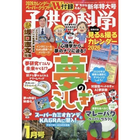 特大号■第1特集 みんな気になる? 夢の正体:誰もが不思議に思う「夢」について大特集。人はどうして夢を見るの?脳のしくみと夢の関係、夢は睡眠の質に影響するのか?夢の内容はどうやって決まる?好きな夢をみるにはどうすればよい? そんな夢にまつわるギモンに心理学の最新研究から答えます。協力:東洋大学社会学部心理学科 松田英子教授■第2特集 宇宙の謎の解明を目指す!巨大実験装置:素粒子の研究施設「スーパーカミオカンデ」、重力波観測装置「KAGRA(カグラ)」、宇宙物理学の最先端である2つの巨大実験装施設を訪問。素粒子とはどのようなものか? 重力波とは何?宇宙の謎とその研究についてわかりやすく紹介します。■特大号W付録;別冊付録カレンダー、とじ込み付録のW付録。