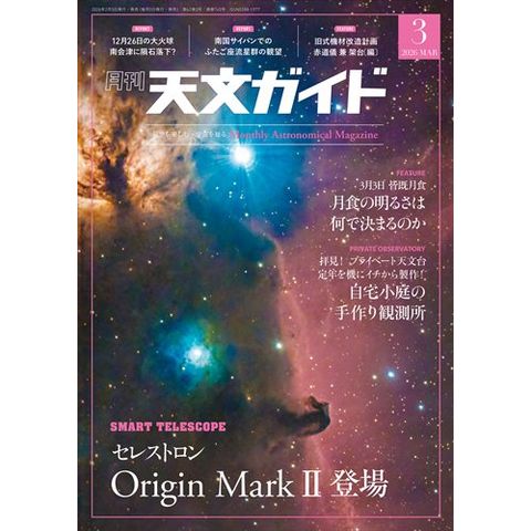 ■スマート望遠鏡「Origin Mark II Intelligent Home Observatory」: セレストロンから発売されたスマート望遠鏡「Origin Mark II Intelligent Home Observatory」は、口径152mm・RASA光学系の天体撮像に威力を発揮する明るい光学系と、セットアップも専用アプリにより簡単に完了。さらにAIを導入した画像処理や画像共有までが可能な、ハイアマチュア注目のスマート望遠鏡です。 天体写真家の沼澤茂美さんが「Origin Mark II Intelligent Home Observatory」で、代表的な天体を撮影し、その画像とともに望遠鏡についてレポートします。■3月3日に起こる皆既月食と皆既食中の月の明るさ: 3月3日の宵に、日本全国で皆既月食が起こります。月は18時50分に東の空で月は欠け始め、20時04分には皆既食となります。皆既食は21時03分に終わり、その後は月は元の姿にもどっていき、22時18分に部分食が終わります。今回の皆既月食は観察しやすく、観測のポイントを解説します。 また、皆既食中の赤銅色の月の明るさが毎回異なりますが、この明るさの違いについては、あまり解説されたことがありませんでした。そこで、これまでに起こった皆既月食の条件を比較して解説、さらに今回の皆既月食の明るさを予測します。■サイパンでふたご座流星群: 12月のふたご座流星群の観測といえば、寒さで凍えながら辛抱強く行うものが常でしたが、暖かく乾季に当たる「サイパン」で、ふたご座流星群の観測と撮影を目的とした、現地発の「ふたご座流星群観測ツアー」が実施されました。夜間、車で立ち入れない青の洞窟こと「グロット」を特別開放して行った、ふたご座流星群観望ツアーの様子を紹介します。