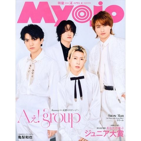 2月20日(金)発売の「Myojo」(みょうじょう/集英社刊)4月号は、結成8年目を迎えたAぇ! groupが通常版とちっこい版の2パターンの表紙を飾るほか、中面12ページの特集や厚紙カードにも登場します。同号の裏表紙にもぜひご注目を。通常版の裏表紙には、ジュニア大賞の目玉部門『恋人にしたい』で頂点に立った“王者”が登場し、タキシード姿でスペシャルショットを披露。ちっこい版の裏表紙には、注目部門『いちばんいいコンビ』で1位に輝いた“最強ペア”が登場します。表紙から裏表紙まで、見逃せない一冊です。 ほか ※通常版とちっこい版で本誌の内容は同じです。表紙、裏表紙、厚紙カードは写真&デザインが異なります。