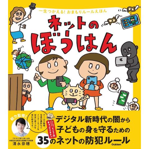 NPO法人体験型安全教育支援機構の代表理事で、『ひるまえほっと 』『すくすく子育て』などに出演する清永奈穂氏が監修。イラストをメインに「ネットの防犯」のルールをわかりやすくまとめています。子どもがこわがりすぎない絵柄で、最後まで読める内容にしています。イラストは、サイゼリヤキッズメニュー間違い探しでおなじみのthe rocket gold star氏。