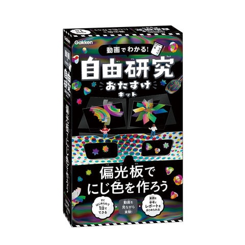 透明なプラスチックが偏光板を通して見るだけで、にじ色に見える! 偏光板を使った実験を通して光のふしぎな性質が学べるキット。科学マジックや美しいアート作品作りも楽しめる。研究のまとめ方実例レポート付きだから、自由研究が1日で完成できる。