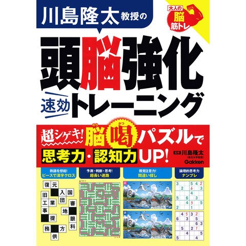 川島隆太教授監修。脳に喝!脳をパワフルに鍛えたい脳トレ上級者へ「大人の脳筋トレシリーズ」第2弾。楽しさ満載&解きごたえのある頭脳トレーニング! イラスト・数字・文字のバラエティーパズル~菓子ブロック分割、鏡絵まちがい探し、ピースはめ込みクロス、6×6ナンプレ、違うピース探し、二字熟語パーツなど、歯ごたえのある頭脳トレーニングを収録。