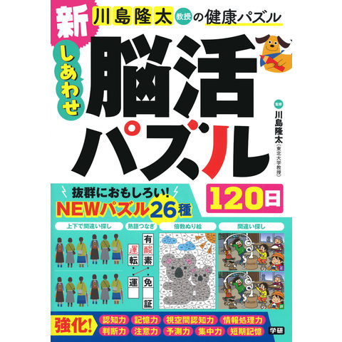 東北大学 川島教授監修。脳が若返る脳トレパズル。オール新作のイラスト、文字、数字の最新パズル26種類は従来にないニュータイプばかりのおもしろパズル。かくれんぼ熟語、イラスト記憶パズル、車のナンバー筆算、熟語つなぎパズル、探しものイラストパズル、割引計算など日本一楽しい脳トレ。ニュータイプの最新脳トレで脳が若返る!楽しいパズルで幸せいっぱいに!