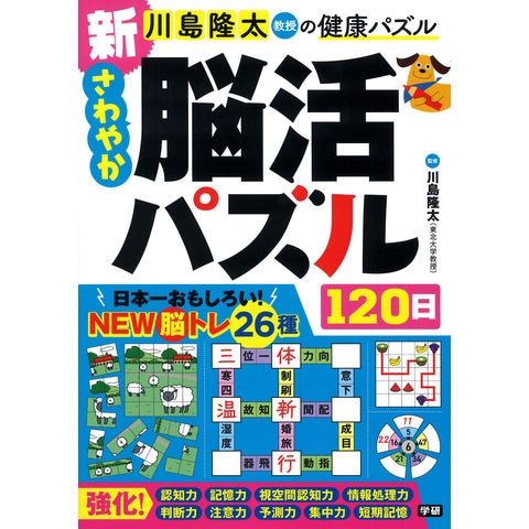 東北大学 川島教授監修。脳が若返る脳トレパズル。オール新作!イラスト、文字、数字の最新パズル25種類は新たに開発したニュータイプのおもしろパズル。絵合わせパズル、カタカナ三字熟語、足し算風車、四字熟語交差点、同じ絵で線つなぎ、計算スケルトン、五字熟語ペア探しなど、日本一楽しい脳トレ!ニューパズルの最新脳トレで脳が若返る!