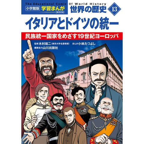 『小学館版 学習まんが世界の歴史 新装版』(全22巻)、第13巻では、19世紀後半に統一国家をつくることに成功したイタリアとドイツを中心に扱っています。長い間、中小国家が分立していたイタリアとドイツが、それぞれのやり方で、同一民族による中央集権国家を築いていく過程を描いています。