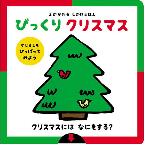 ・矢印を下に引くと、絵が変わるしかけです。表紙のクリスマスツリーがなんと、一瞬できらきらに!