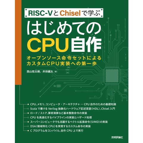 本書では、UCバークレーで開発されたオープンソースの命令セット(ISA)「RISC-V」を用いて、CPUの作り方を解説します。コンピュータアーキテクチャ、ハードウェアに関する知識があまりない方にも理解できるように基礎からわかりやすく学んでいきます。CPUとコンピュータアーキテクチャのしくみを解説したうえで、基本整数命令の実装から、CPUの高速化で活躍するパイプラインの実装、スーパーコンピューターでも活躍するベクトル拡張命令(SIMD)、さらに、汎用CPUでは負荷の高い処理をより高速に実行するためにCPUへ追加可能なカスタム命令の実装までを行います。CPU設計に用いる基本言語としては、Velilogを抽象化したHDL(ハードウェア記述言語)であるChiselを利用しています。
