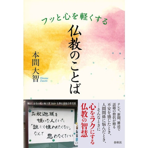 「輝け! お寺の掲示板大賞」仏教伝道協会賞(2019)、仏教タイムス賞(2021)を受賞するなど活躍中の著者が、不安を感じたときや人間関係に悩んだときなど5つのテーマにあわせて、心を軽やかに解放してくれる名言を、仏教のお経・僧侶・信者の言葉から選んでわかりやすく語る。