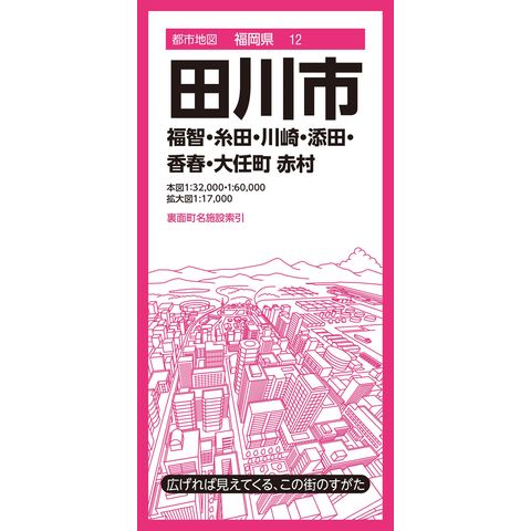 田川市、福智町、糸田町、川崎町、添田町、香春町、大任町、赤村の全域を1:32,000図と1:60,000図で収録、田川市の中心部をより詳しい1:17,000図で収録しています。裏面には町名索引と施設索引を収録し、役所、官公署、公共施設、学校などの検索に便利です。