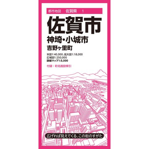 佐賀市、神埼市、小城市、吉野ヶ里町を1:40,000図で、佐賀市の主要部および神埼市の中心部を1:18,000で収録しています。また全域を1:250,000図で収録しています。さらに佐賀駅周辺エリアの詳細マップを1:5,000図で収録しています。付録裏面には町名索引と施設索引を収録し、役所、官公署、公共施設、学校などの検索に便利です。