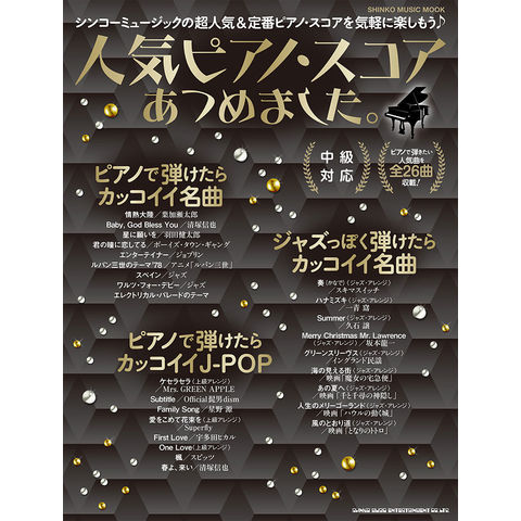 "シンコーミュージックの誇る、人気&定番ピアノ・スコアが気軽に楽しめるピアノ楽譜集ムックが新登場!2026年にシリーズ創刊20周年を迎えるピアノ楽譜集「あつめました。」シリーズより、特に人気のあるスコアを厳選して1冊にぎゅっと収載しました。基本的な中級アレンジのほか、弾き応えのある上級アレンジやジャズ・アレンジなど、様々な譜面形態で様々なジャンルの名曲を楽しめます。曲目●【ピアノで弾けたらカッコイイ名曲】情熱大陸(葉加瀬太郎)/Baby, God Bless You(清塚信也)/君の瞳に恋してる(ボーイズ・タウン ・ ギ ャ ン グ )/ ス ペ イ ン( ジ ャ ズ )/ ワ ル ツ・フ ォ ー・デ ビ ー( ジ ャ ズ )/ 他 【 ピ ア ノ で 弾 け た ら カ ッ コ イ イ J-P O P 】ケ セ ラ セ ラ( M rs. G R E E N APPLE)<上級アレンジ>/Subtitle(Official髭男dism)/Family Song(星野 源)/One Love(嵐)<上級アレンジ>/他 【ジャズっぽく弾けたらカッコイイ名曲】奏(かなで)(スキマスイッチ)<ジャズ・アレンジ>/ハナミズキ(一青 窈)<ジャズ・アレンジ>/他、全26曲"