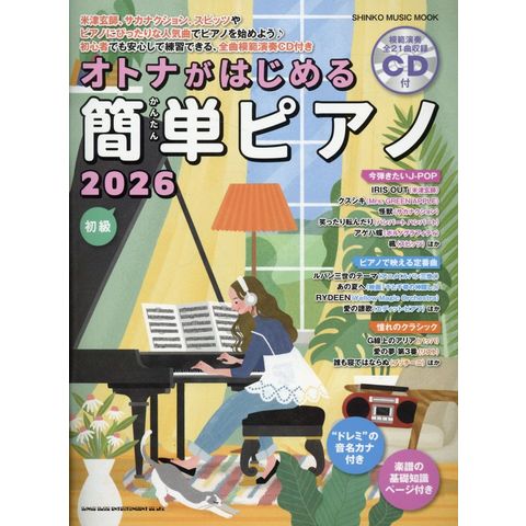 オトナ初心者向け模範演奏CD付きピアノ楽譜集ムックに2026年ver.が新登場!「IRIS OUT」「クスシキ」「怪獣」「アゲハ蝶」「RYDEEN」「誰も寝てはならぬ」など、様々なジャンルから全21曲を収載しています。全曲音名カナ入り&模範演奏付きでの収載なので、ピアノを始めたての方はもちろん、久しぶりにピアノを再開したい方にもオススメの一冊です♪曲目●IRIS OUT(米津玄師)/クスシキ(Mrs. GREEN APPLE)/怪獣(サカナクション)/笑ったり転んだり(ハンバート ハンバート)/アゲハ蝶(ポルノグラフィティ)/楓(スピッツ)/あの夏へ(映画「千と千尋の神隠し」)/RYDEEN(Yellow Magic Orchestra)/愛の讃歌(エディット・ピアフ)/G線上のアリア(バッハ)/誰も寝てはならぬ~歌劇「トゥーランドット」より(プッチーニ)/他、全21曲
