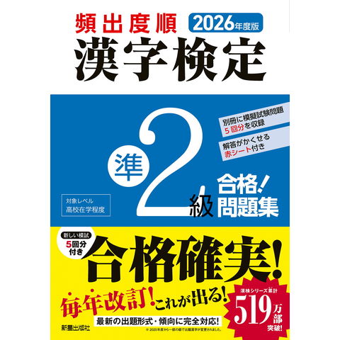 別冊には書き込み式模擬試験問題5回分を掲載。資料には、「中学校で習う特別な読みの用例」「熟字訓・当て字」「準2級以下の配当漢字表」「部首一覧」などを収録、この1冊で効率よく学習できます!