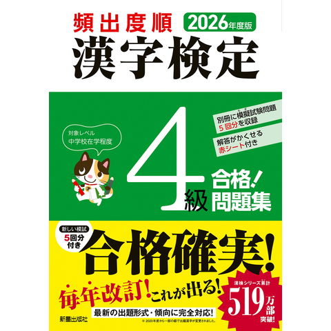 また、4級新出漢字をより効率よく学習できるよう、4級新出漢字の頻出度順に対応させて「漢字表」と「読み」の問題を順に掲載。