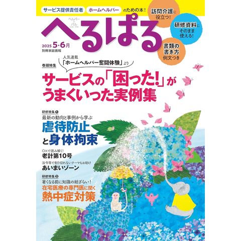 創刊から続く連載「ホームヘルパー奮闘体験」は、読者の皆さまが奮闘の末に乗り越えた事例を本音で語ってもらい大人気になりました。今号はその拡大版を新たな事例の詳しい解説と共に巻頭特集でお届け。きっと参考になる事例があるはずです。 研修テーマは“最新の動向と事例から学ぶ「虐待防止と身体拘束」”と暑くなる前におさらいしたい“熱中症対策”の2本。その他にも、新連載「職場環境等要件」の取り組み、あいまいゾーン、介助術、料理レシピ、奮闘体験、老計第10号、書類の書き方、など現場で役立つ記事満載でお届けします。