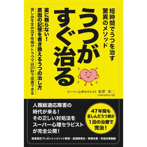 人類総適応障害の時代が来ると言われる現代、その正しい対処法をスーパー心理セラピストが完全公開!「薬に頼らず、原因の記憶を書き換えるうつの治し方」や「苦しみを生み出す性格やトラウマをたったは20秒で改善する方法」などを開発。まさに短時間でうつを治す驚異のメソッドです。47年間も苦しんだうつ病が1回の治療で完治した事例なども紹介されています。うつに悩む、全ての人に朗報となる渾身の一冊です。