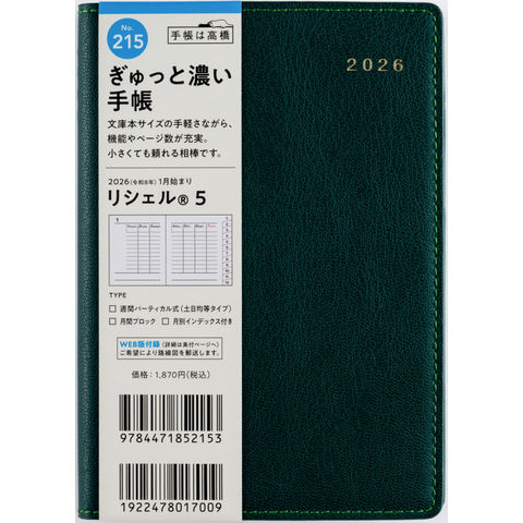 215 リシェル5 手帳 高橋書店 2026年版 カメリアグリーン ウィークリー A6判
