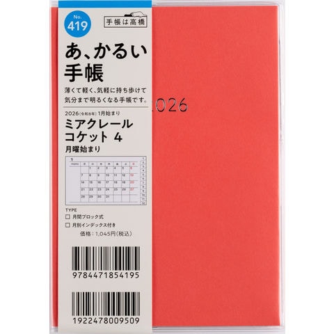 419 ミアクレールコケット4 月曜始まり 手帳 高橋書店 2026年版 赤 マンスリー A6判